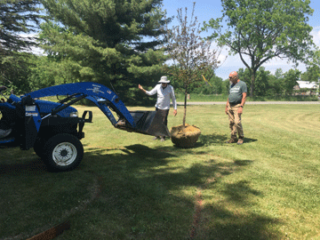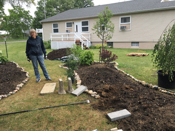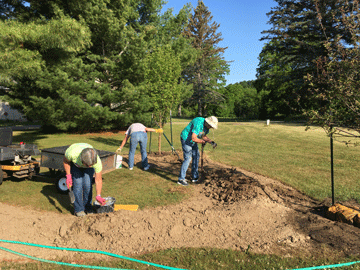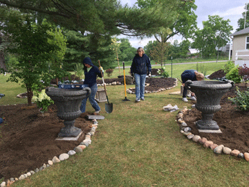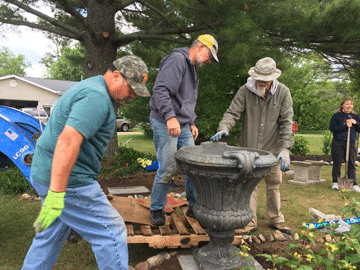 Dan worked closely with the great folks at Horrocks Garden Center. When they realized what the project was about, they did what they could to help us with the cost of the many trees, plants and shrubs. They also had two amazing urns that now mark the entrance to the garden. These planters are beautiful and exactly what we needed. However, they are what anyone would consider HEAVY! Again it took a lot of muscle to get them in place. These were all volunteer people working hard so that YOU would have this place to pray. Enjoy the efforts of their labor.